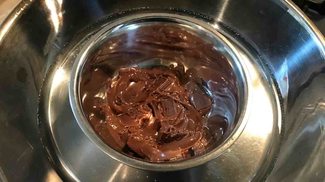耐熱容器にチョコレートを割り入れ、湯せんにかけて溶かします。