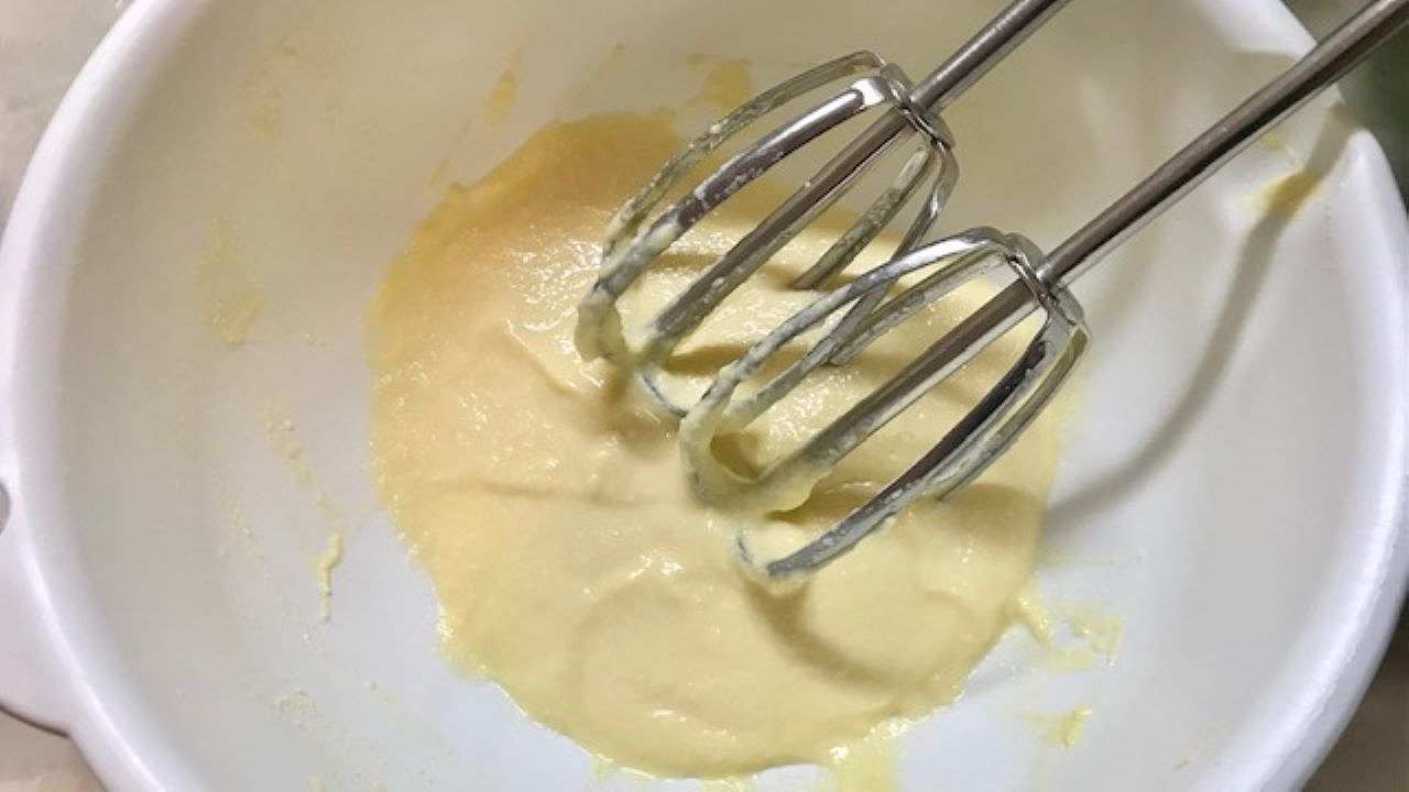 別のボウルに豆腐、卵黄、砂糖を入れ、ハンドミキサーで全体が均一になるまで混ぜ合わせます。豆腐はこしてもOK!よりなめらかになります。