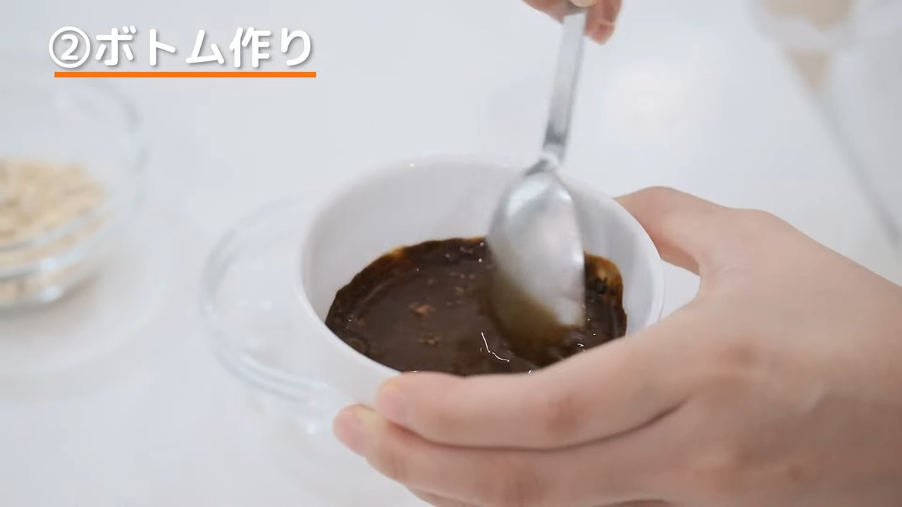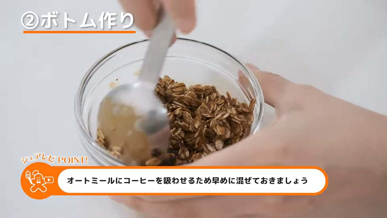 コーヒーが馴染んだオートミールを4等分して、プリンカップの底に1/4量ずつ入れる。- 2