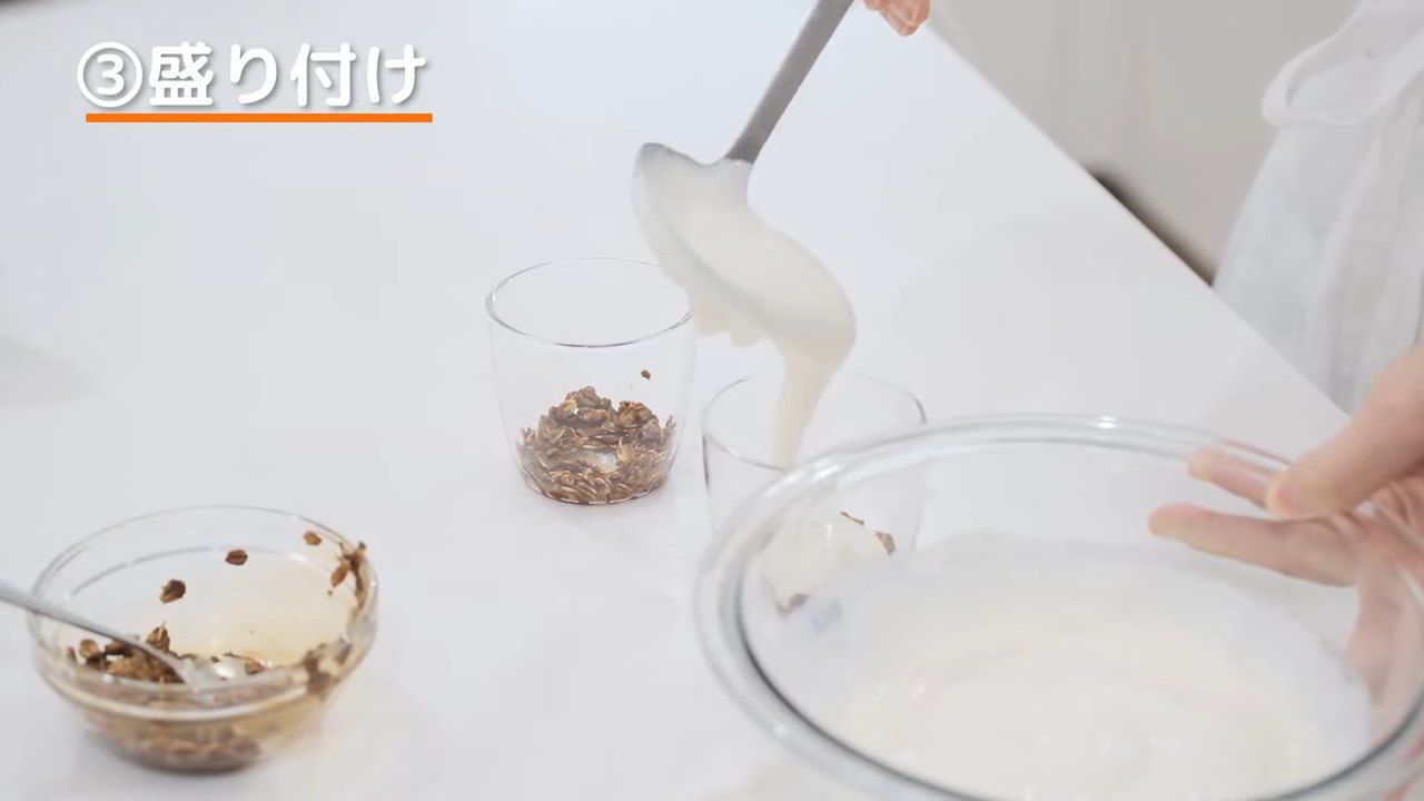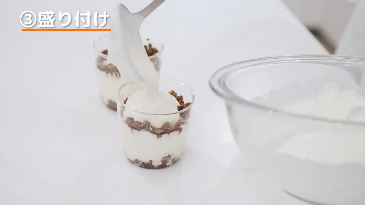 残りのオートミールを入れ、クリームをカップの上まで重ねる。冷蔵庫で2時間以上冷やす。- 4