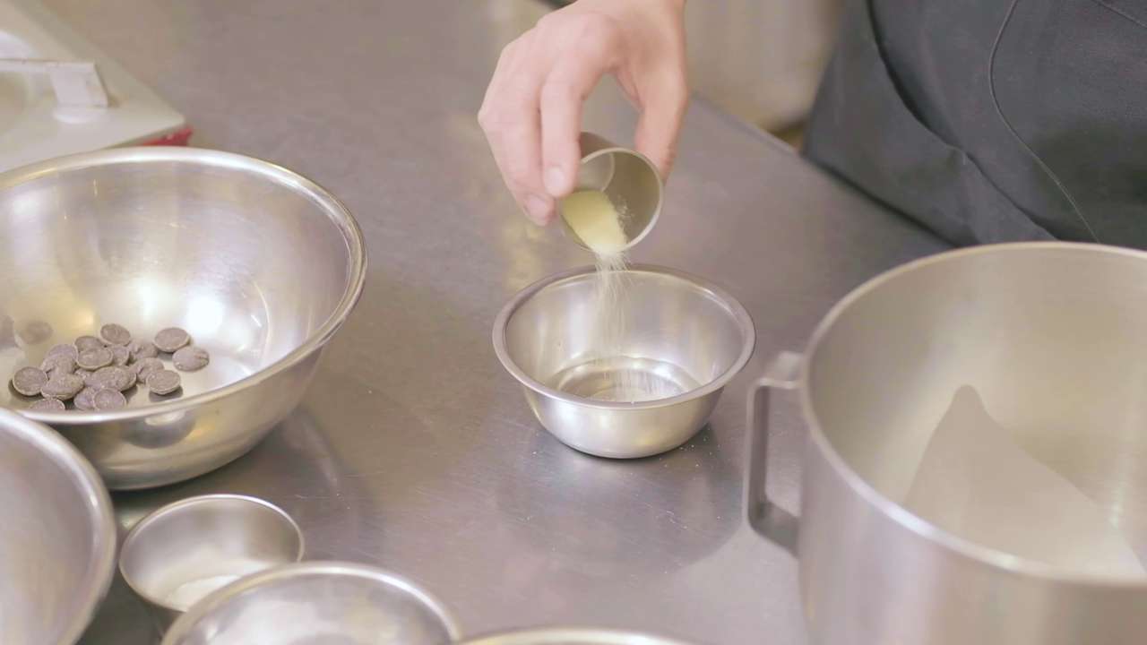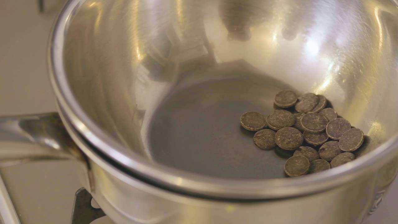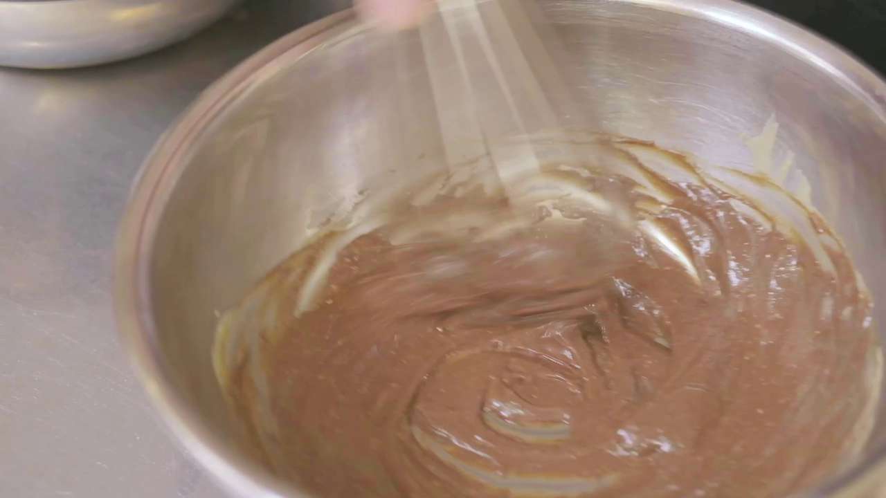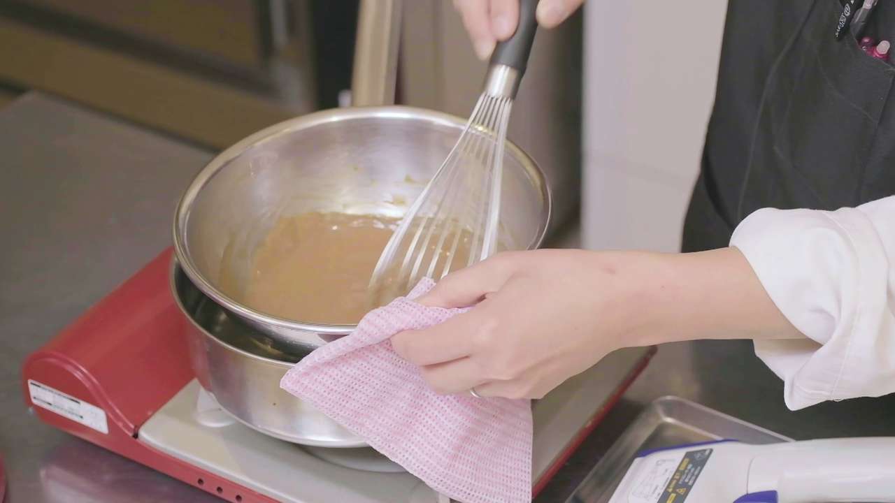 溶かしたダークチョコレートにアングレーズソース(75g)を加える。30〜35度になるように湯煎で調温する。