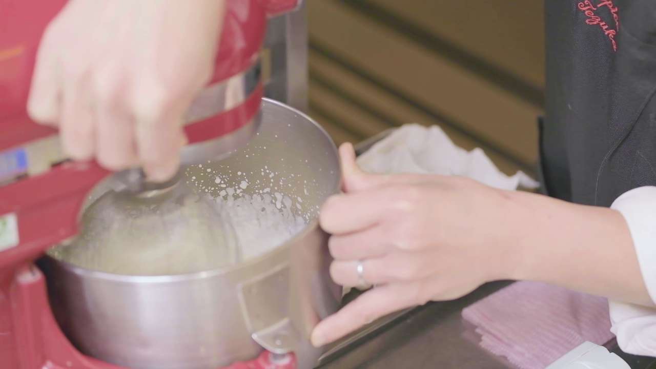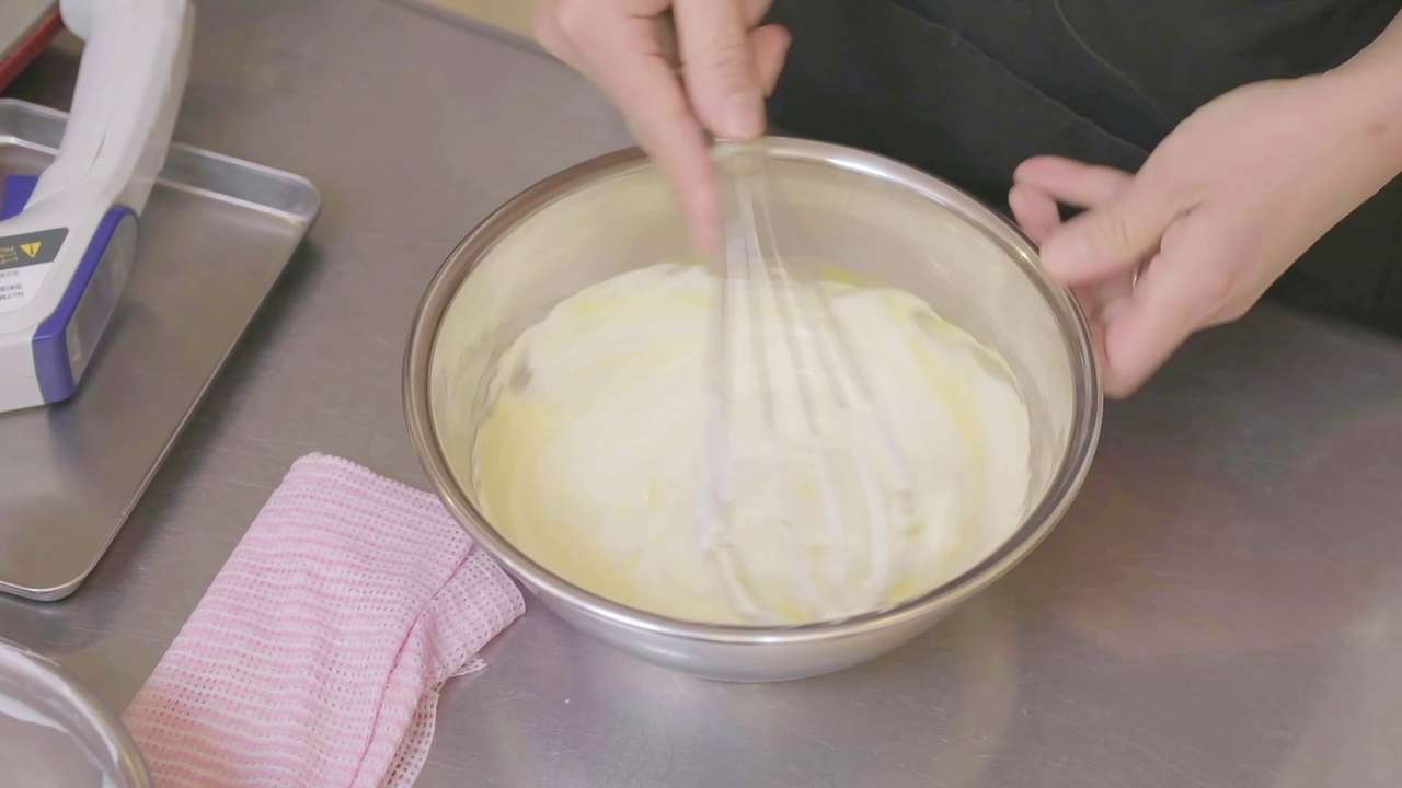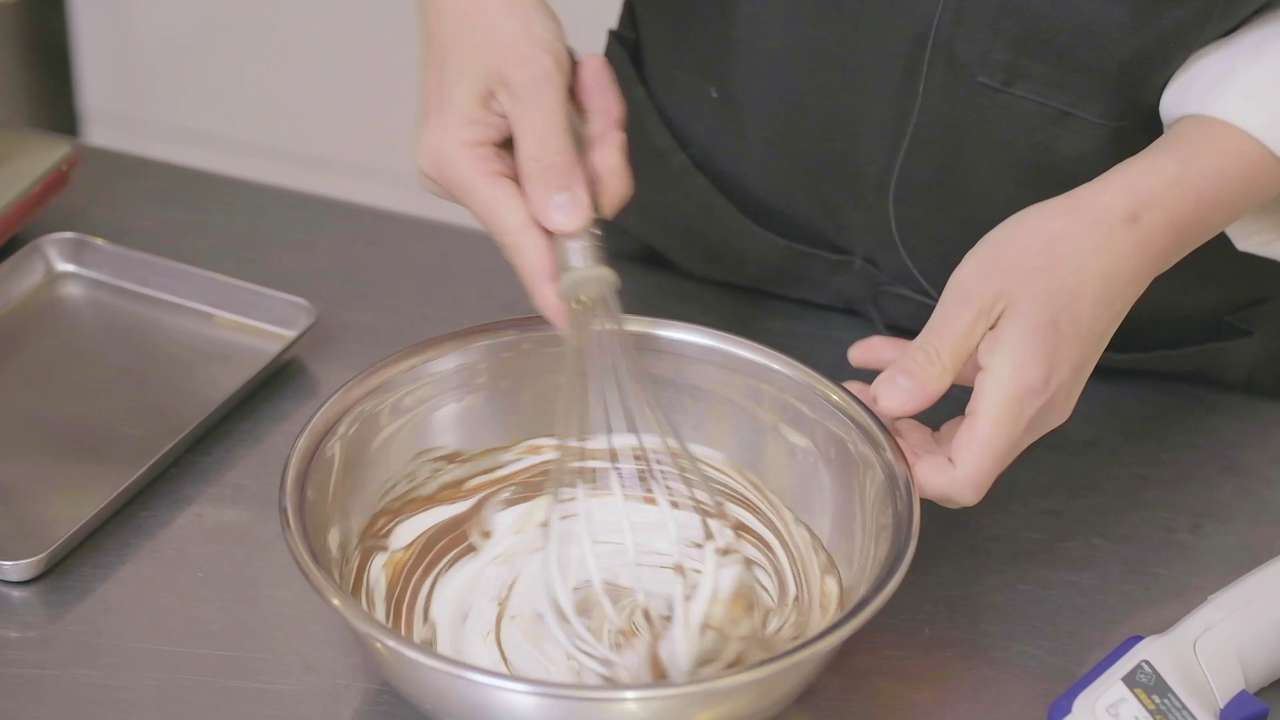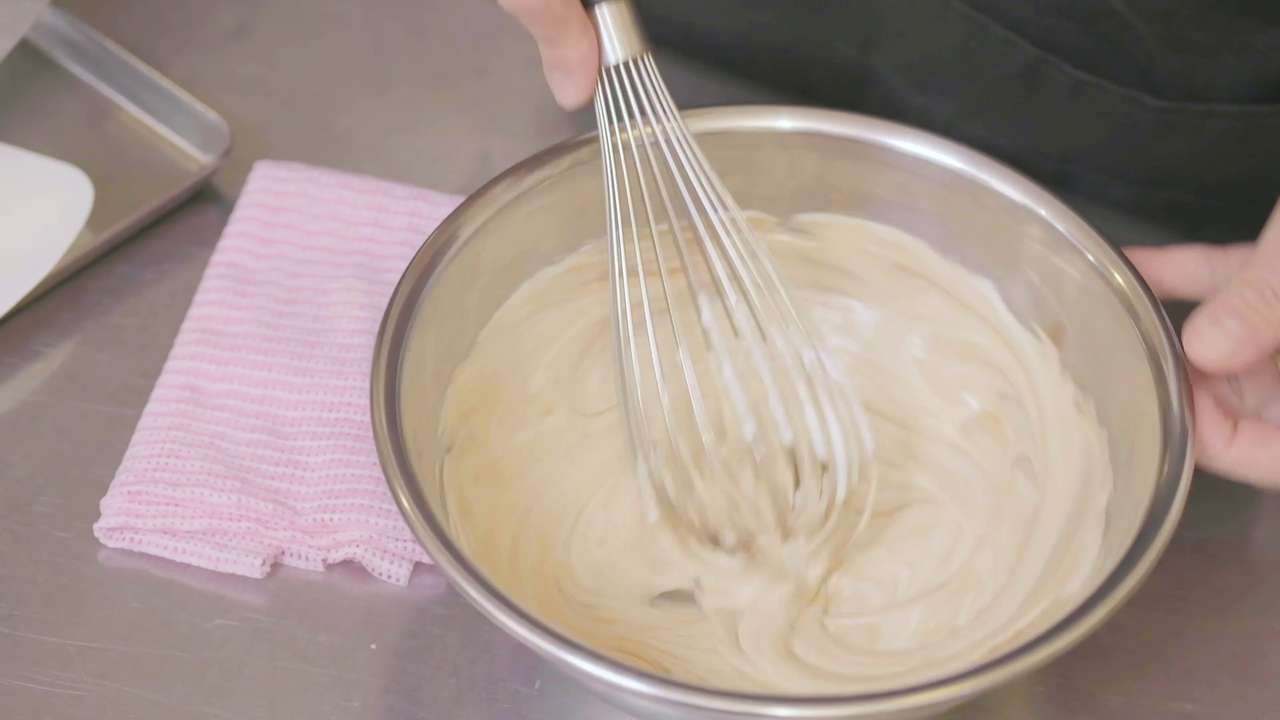 7分立ての生クリームを混ぜ合わせる。ある程度混ざったらゴムベラで筋がなくなるまでしっかり混ぜる。