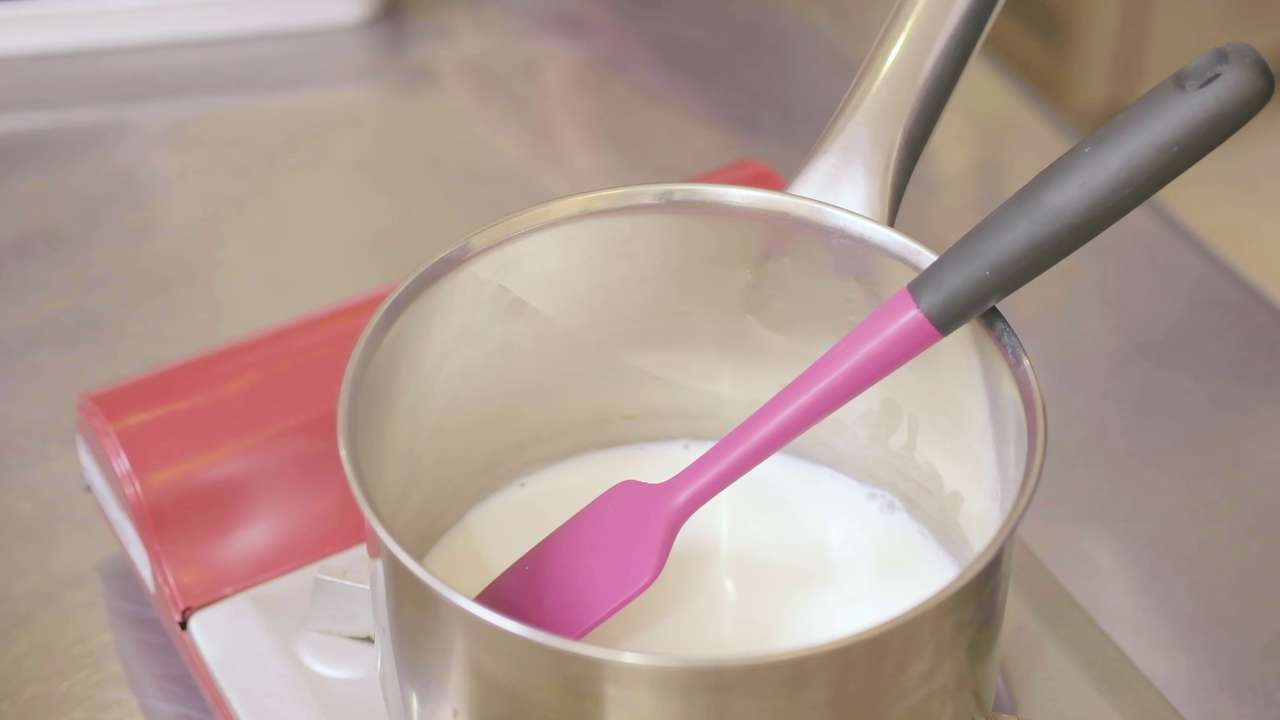 牛乳にひとつまみのグラニュー糖と裂いたバニラビーンズを加え、沸騰させる。