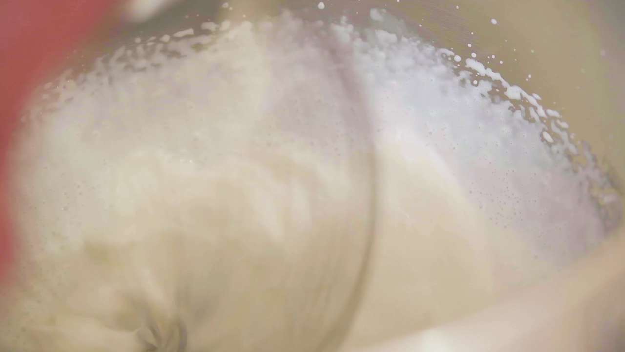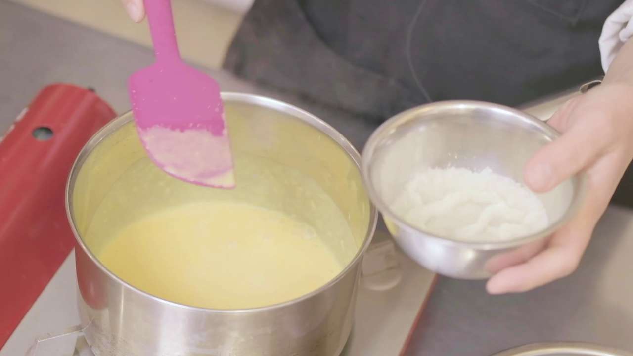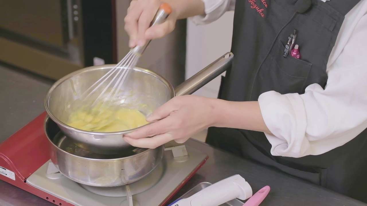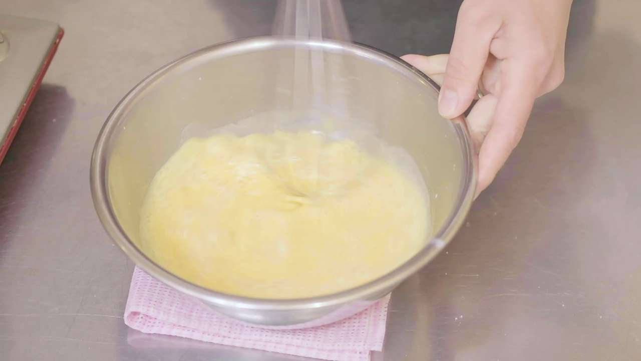 卵黄とグラニュー糖をすり混ぜて、牛乳と合わせる。