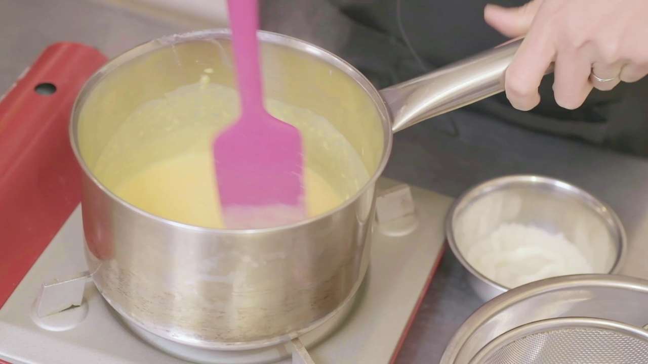 鍋に戻して混ぜ続けながら83℃になるまで弱火~中火で加熱する。