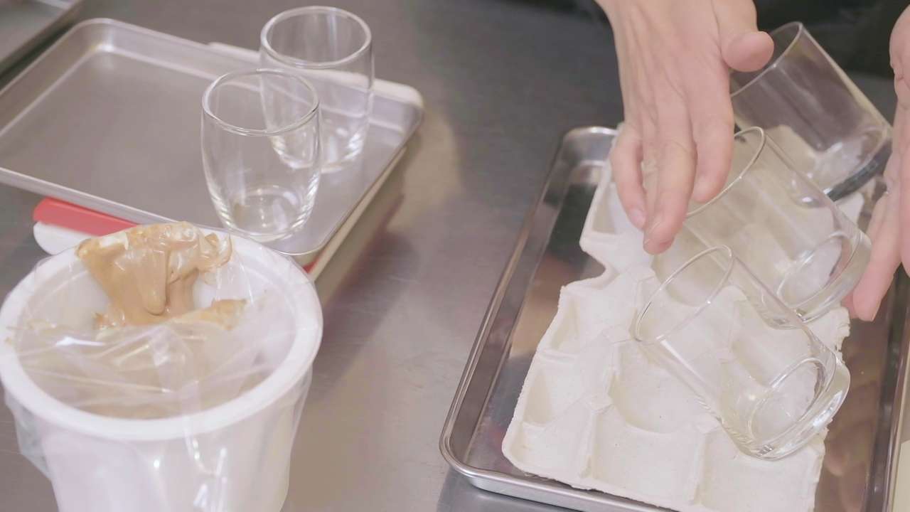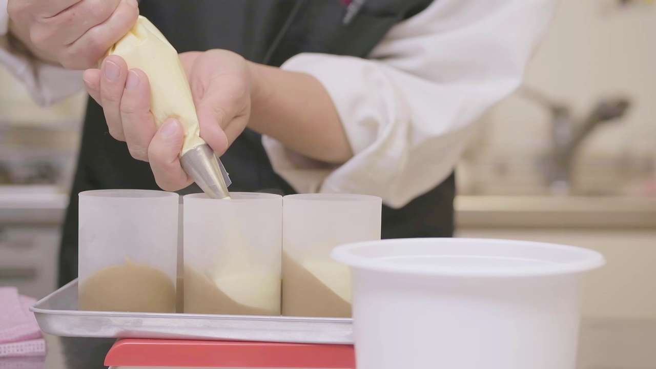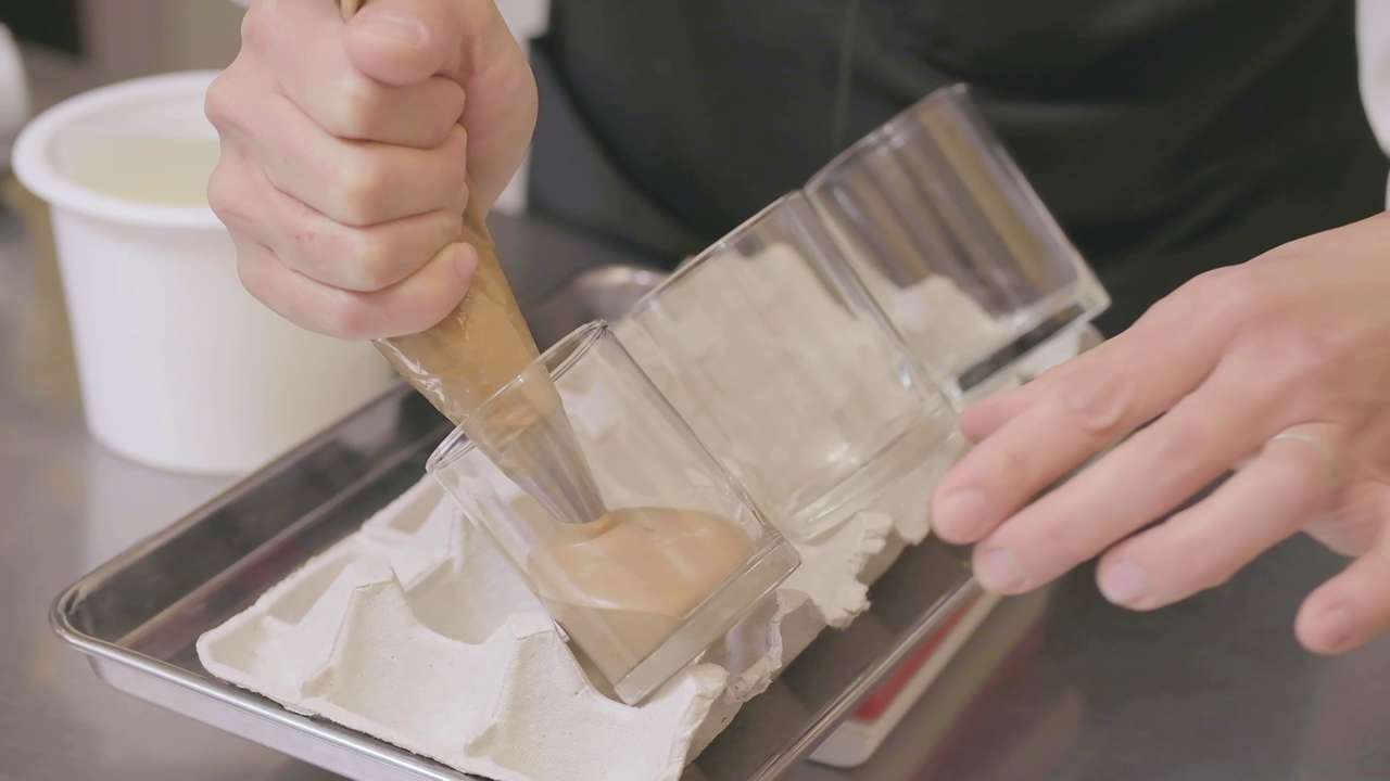 ムースを絞り袋に入れ、グラスの底に30gずつ流す。