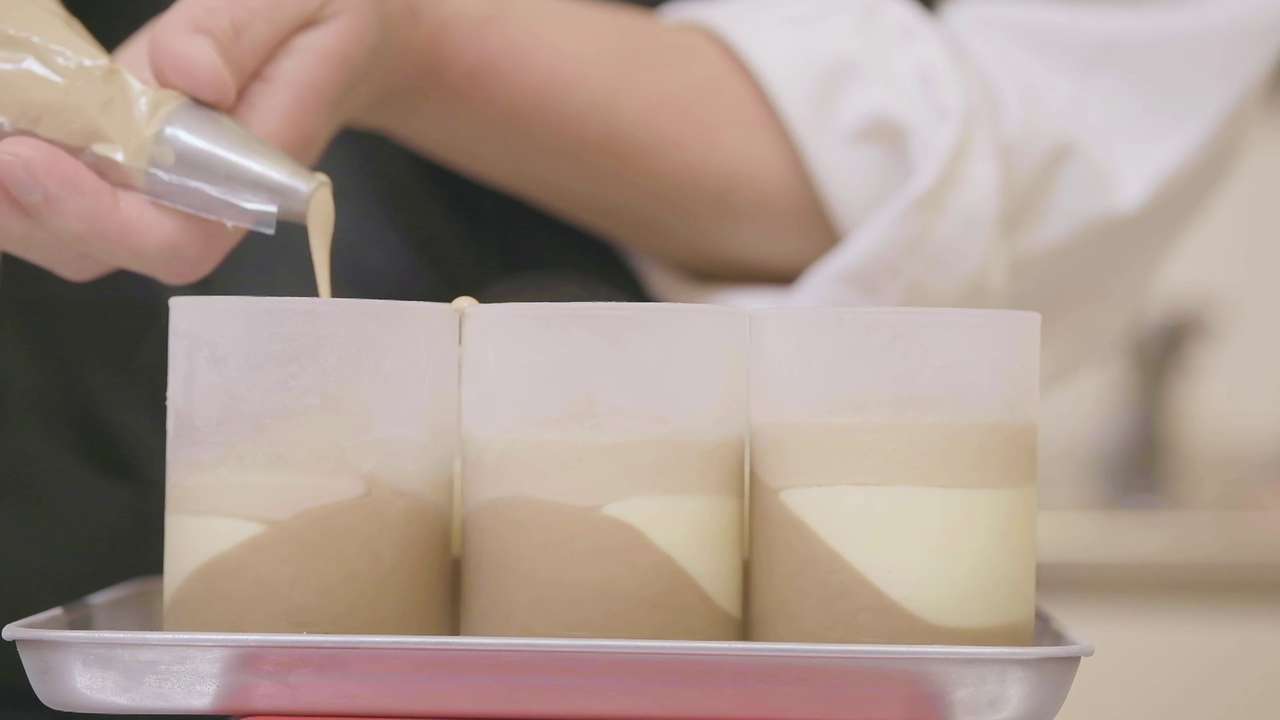 ムースを絞り袋に入れ、クレームショコラ・ダークを冷やし固めた上に30gずつ流す。(2段目からはグラスを傾けなくて良い)