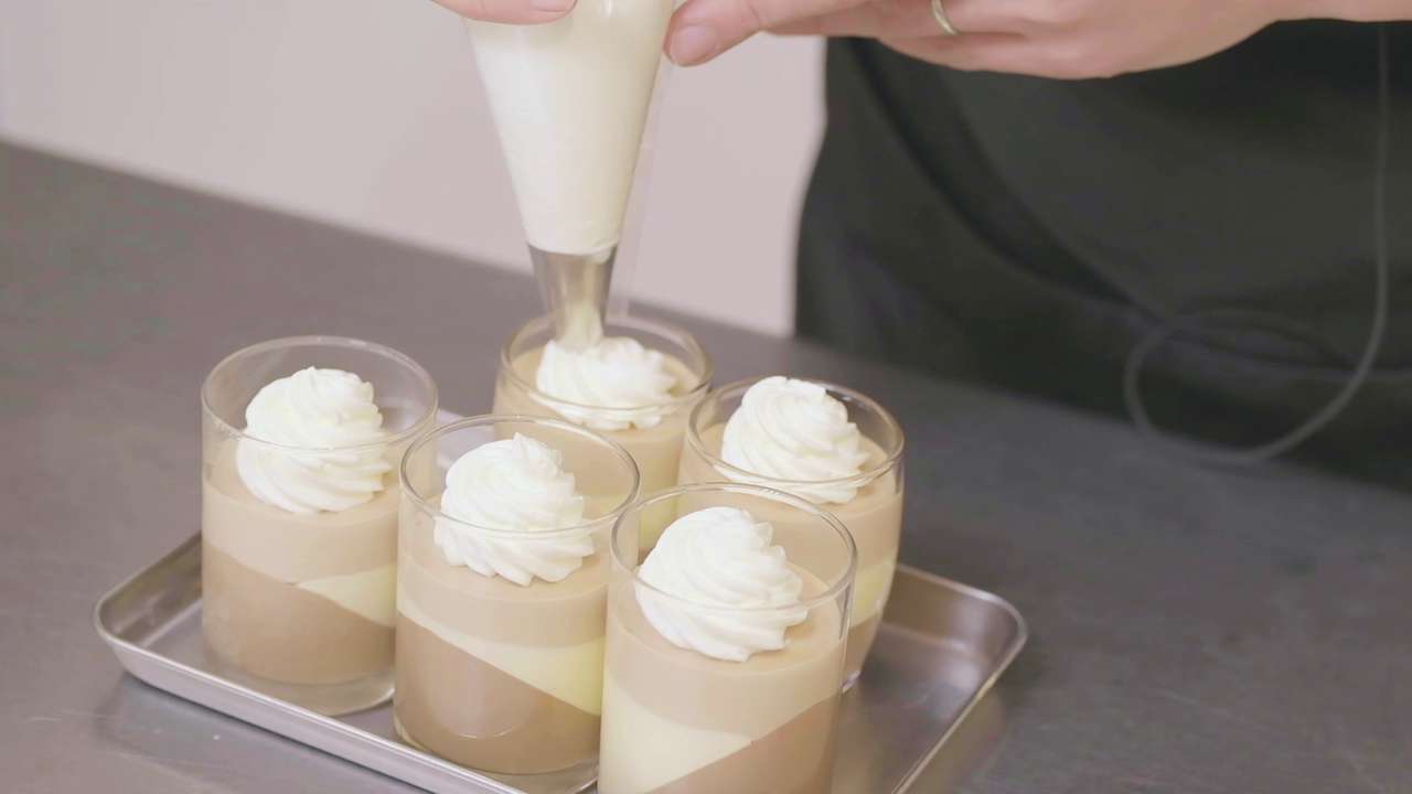 絞り袋に入れ、クレームショコラ・ブランを冷やし固めた上に30gずつ流す。