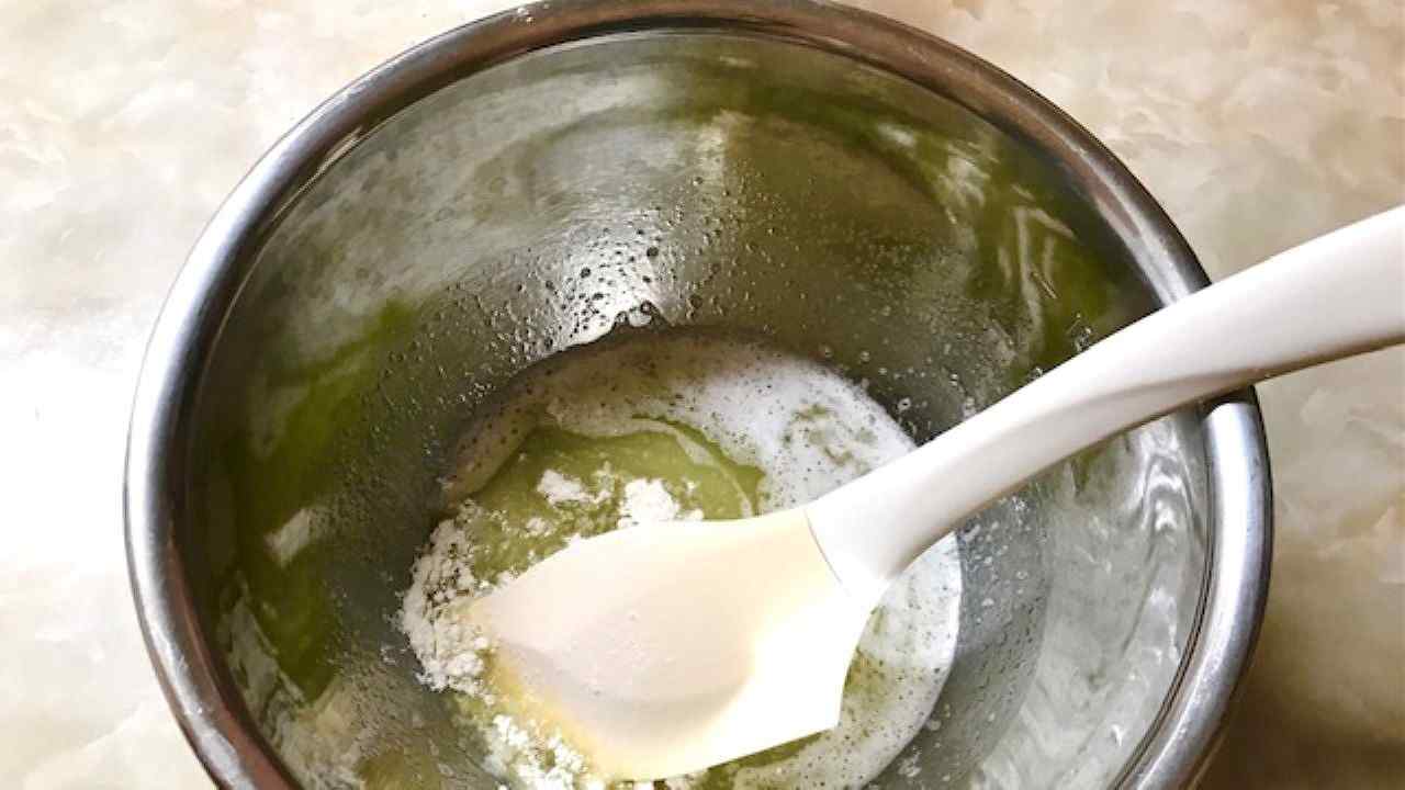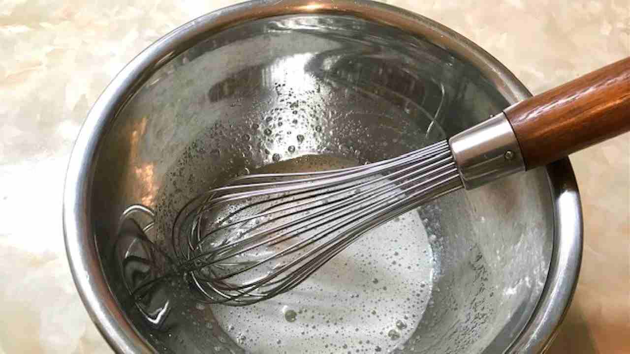 ボウルに卵白と砂糖を入れて泡立て器で混ぜ合わせます。泡立てないようにしてください。