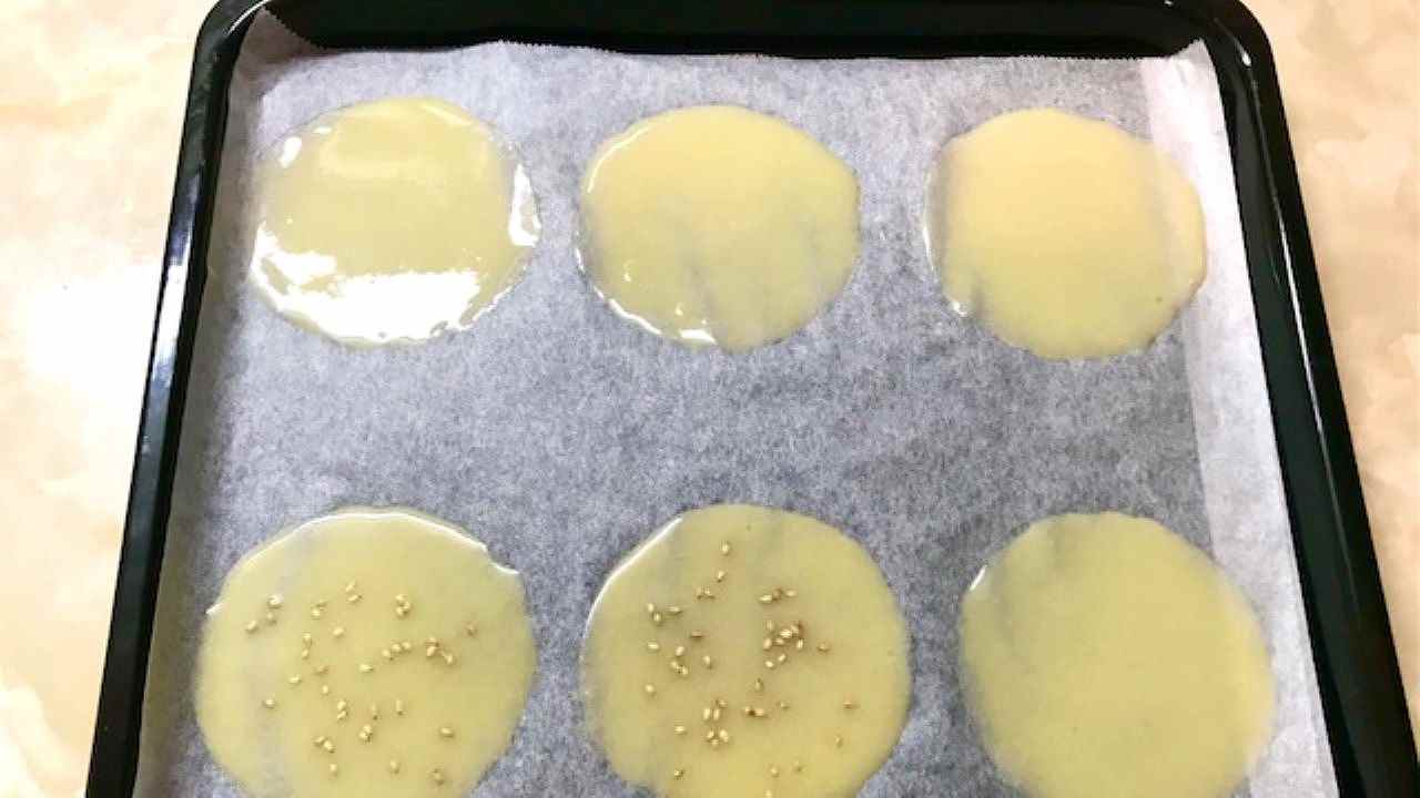 お好みで白ごまを散らしたら170℃のオーブンで8~10分、焼き色がつくまで焼きます。