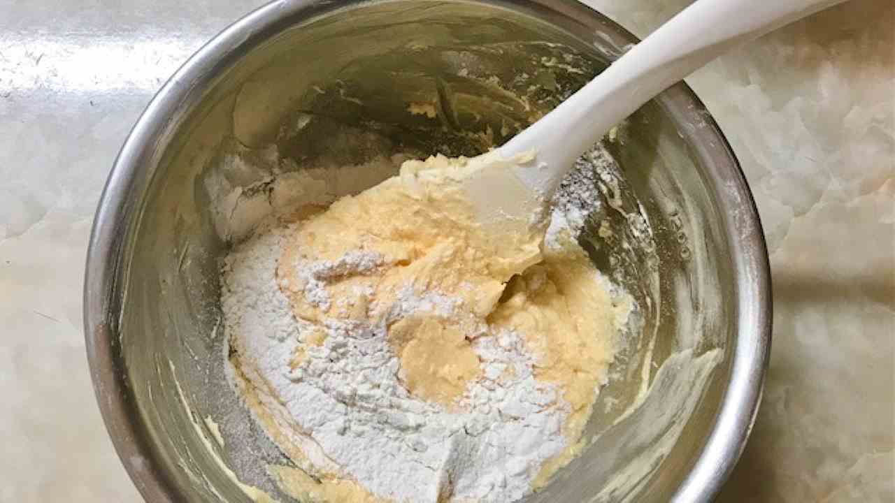 粉類を入れ、ゴムベラでボウルの底から生地をすくって返すように混ぜます。