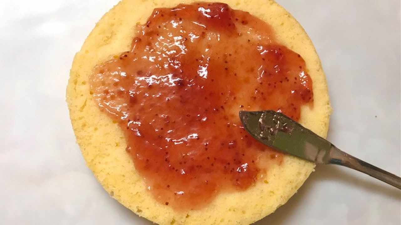 粗熱がとれたら、型から出して半分の厚さにカットし、まんべんなくジャムを塗ります。