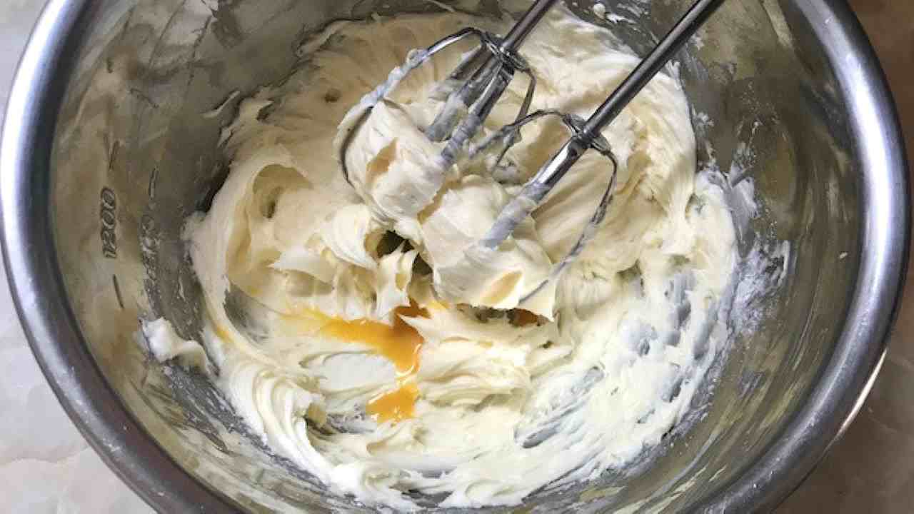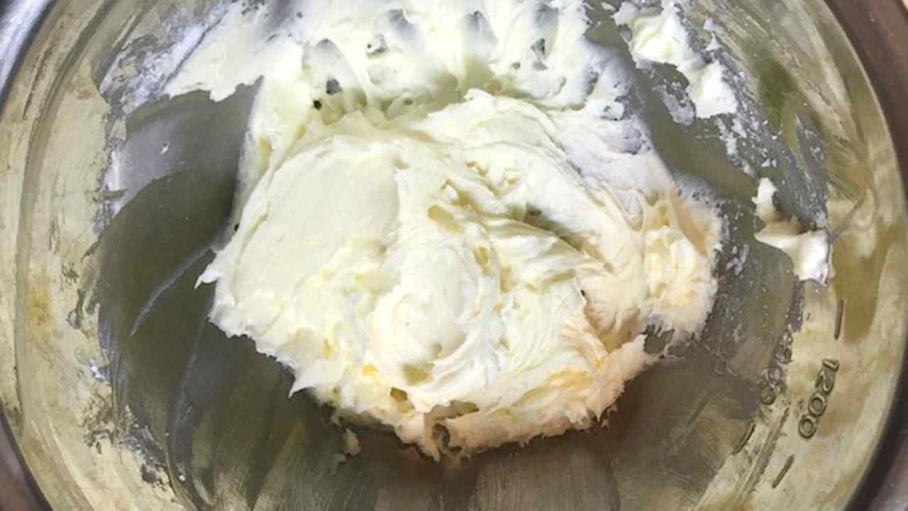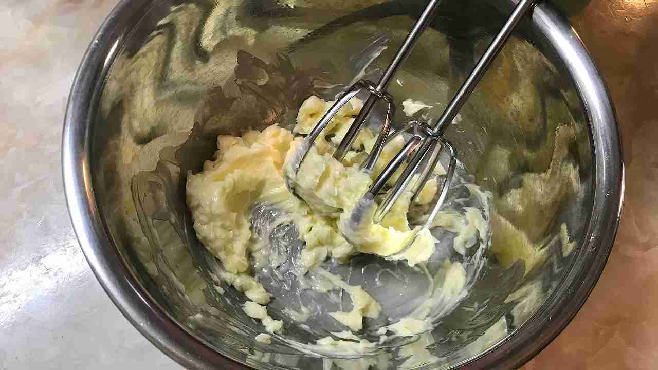 ボウルにバターを入れ、ハンドミキサー(低速)または、泡立て器でなめらかなクリーム状になるまで練り混ぜます。