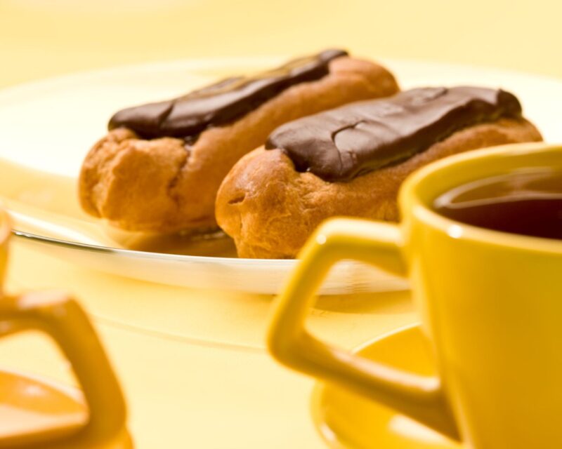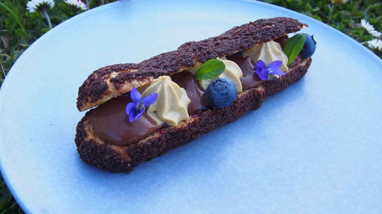 カカオパウダー入りクロカンをシューの表面に焼き付けて作る、ワンランク上のエクレアです。