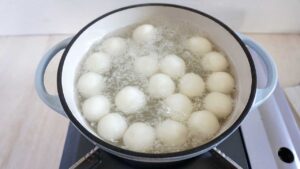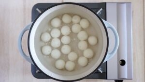 出来上がった白玉団子を放っておくと、乾燥して固くなってしまうので、そうなる前に水に浸して乾燥を防げば、もちもち食感が保てます。